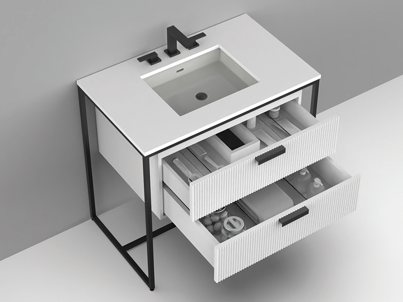 The Trapezio freestanding vanity combines architectural style with functional design, redefining traditional vanities. Its distinctive geometric shapes and bold lines enhance bathroom aesthetics, especially in compact spaces, turning them into sophisticated focal points. Available with fluted or flat front drawer panels. Available finishes include Fluted English Walnut, Fluted Matte Black, Fluted White panels, Flat Natural Oak, and Flat Natural Walnut panels. Hardware options are offered in Matte Black, Satin Brass, Polished Nickel, Brushed Nickel, and Polished Chrome. Countertop options are Black, White, White Carrara Quartzstone, or White X-Stone. This double drawer vanity measures 22" deep and comes in widths of- 30" and 36". The Trapezio model offers quality craftsmanship, premium materials, and durable construction.