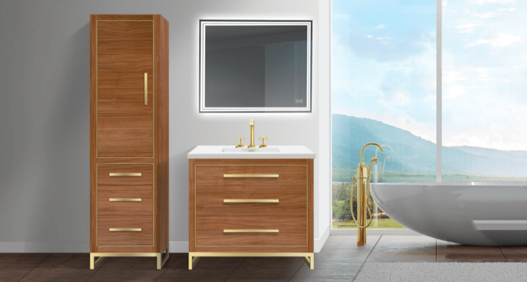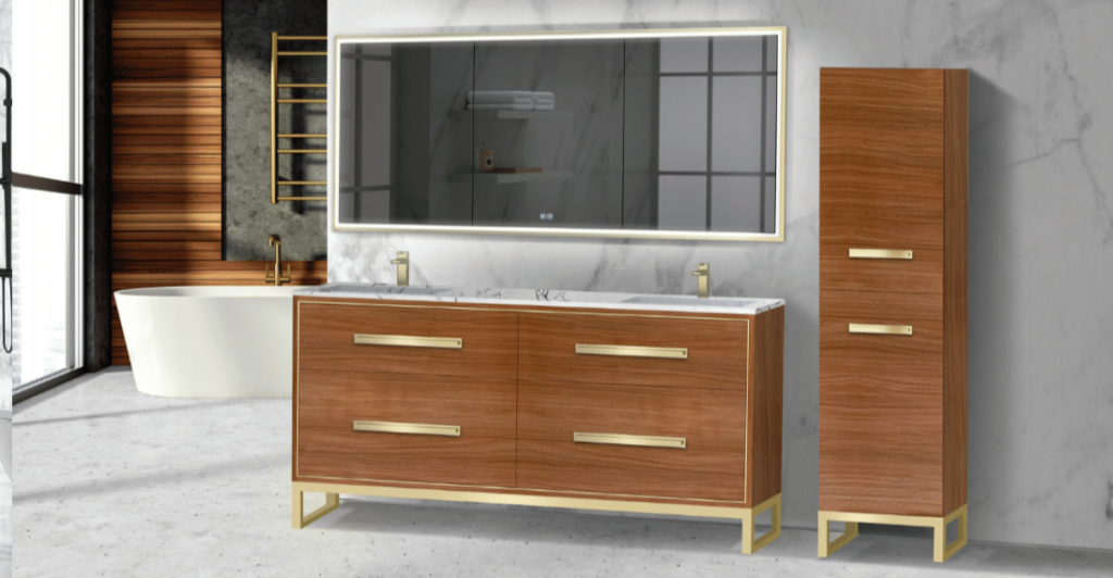 The Pinnacle Collection represents the zenith of modern bathroom design with its clean lines and warm walnut tones. Golden accents enhance the collection’s aesthetic, offering a perfect mix of luxury and contemporary elegance. The natural walnut finish adds a layer of sophistication and an organic texture that elevates the overall look, making it a striking choice for any modern space.