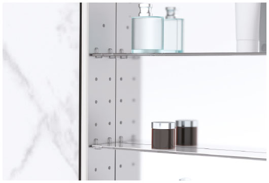 Storage inside Madeli cabinets is anything but ordinary. Each unit includes adjustable Low Iron Ultra-Klear™ glass shelves that enhance the clarity and brightness of the cabinet interior. These shelves resist the green tint commonly seen in standard glass, ensuring that stored items are presented clearly and cleanly. Shelves are adjustable every two inches for ultimate storage flexibility, and installation is easy and quick.