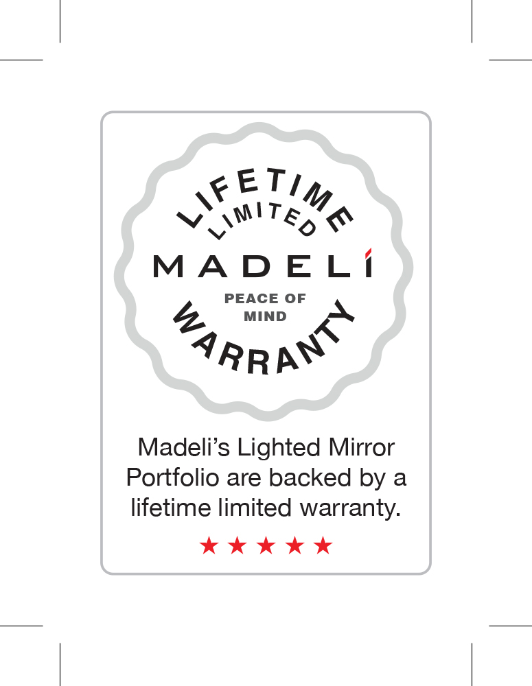 Madeli stands behind the Slique™ Lighted Mirror collection with a lifetime manufacturer’s warranty, underscoring our commitment to lasting quality and performance. Each mirror is UL certified for safety and reliability. The Madeli lighting system is engineered with premium components, including high-grade transformers, responsive digital dimming controls, long-lasting LED technology, and full-width defogger pads to ensure durability and dependable use for years to come. The mirror glass also features a proprietary GreenShield™ protective backing and sealed edges to help prevent black-edge desilvering over time.