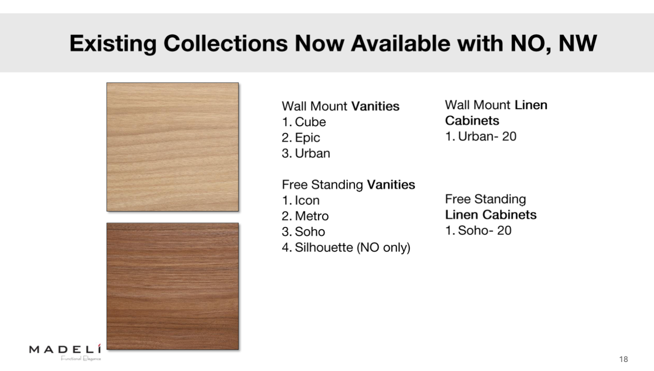 Natural Oak and Natural Walnut are now available across even more of our categories, including wall mount vanities, free standing vanities, and linen cabinets: