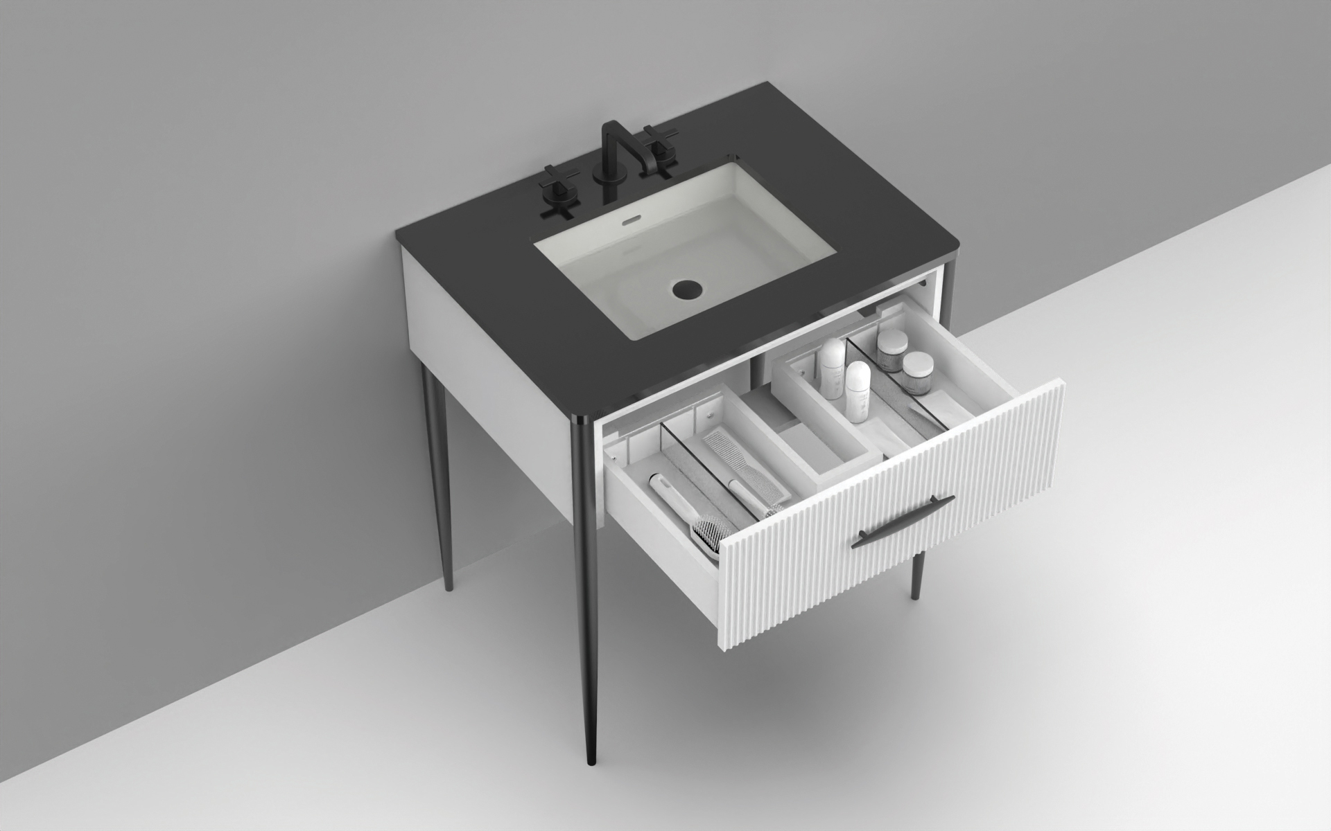 Avella Quattro with White fluted panel and a Black Quartzstone countertop
