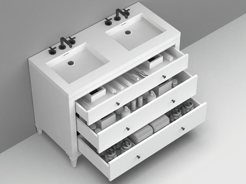 Available in three rich finishes including Sapphire, Studio Grey and White. Drawer knobs available in your choice of lustrous Satin Brass, Matte Black, Polished Chrome, Polished Nickel, Brushed Nickel, or no drawer holes drilled. An extensive choice of countertop/basin color and material options complete the design possibilities, including X-Stone™ Solid Surface, and Quartzstone™. Premiere features include adjustable tempered glass dividers, drawer organizer bins, optional electrical outlets, full extension soft-closing glides, matching interior finishes and other signature Madeli details mean you’ll always have a perfect blend of beauty, quality and function.