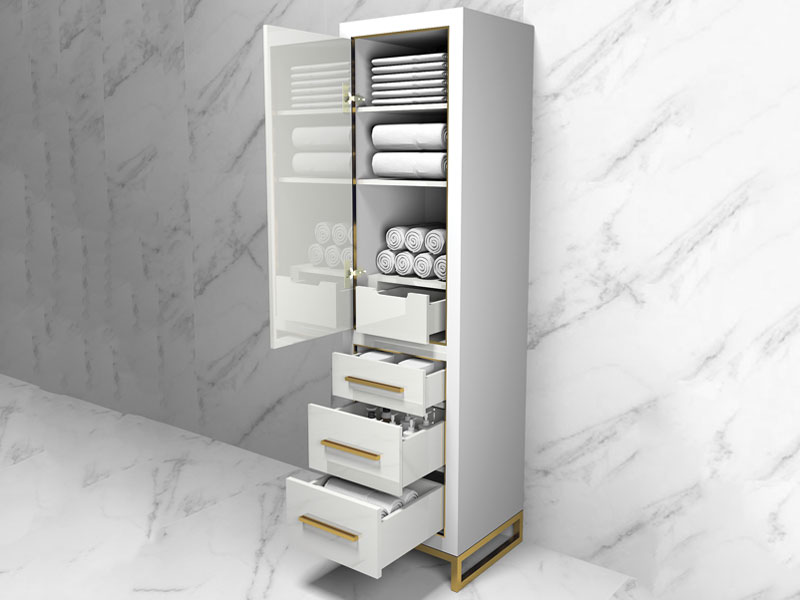 Sleek and yet substantial, the new Estate Collection vanity adds true glamour to your bathroom with stylish metal inlay decor and long sleek handles available in a choice of lustrous satin brass, matte black, polished chrome, polished nickel and brushed nickel. Your choice of a matching metal wrap-around base or legs completes the sophisticated custom furniture look. Choose from four polyurethane-protected colors including White, or new arrivals Natural Walnut, Natural Oak, Brandy woodgrain, Studio Grey or Sapphire finishes, and pair it with a variety of countertop/basin options in X-Stone™ Solid Surface, Quartzstone, glass or ceramic to create your own custom look. With the advantage of Madeli’s extensive storage options, soft-closing European hardware, and other standard luxury features, your vanity will be the star of your bathroom.