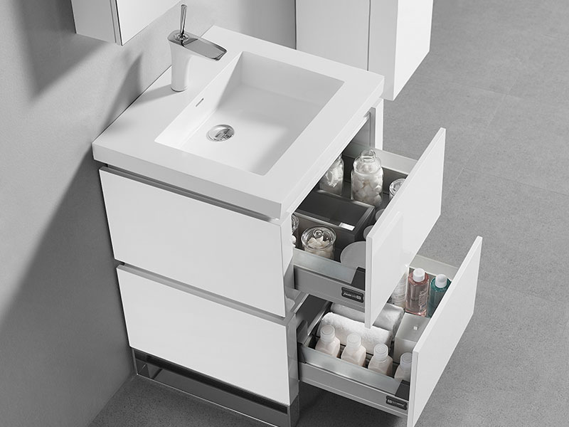 Featuring straight lines and sophisticated design, the Metro Collection offers Italian-style integrated continuous handles, a larger than average 28" height for extra storage space, deep drawers with full 18”-extension Grasshopper® soft-closing glides and concealed interior drawers. Choose from a rich Walnut or Ash Grey woodgrain or a White polyurethane-protected finish. Choice of countertops and basins include X-Stone™ Solid Surface, Quartzstone™ and a pristine glass top with ceramic bowls in White or Biscuit. Available with your choice of the simple L-feet or open rectangular S-feet in polished chrome or brushed nickel, the Metro’s sleek, modern lines coupled with its unprecedented storage space are the fullest embodiment of Madeli’s Functional Elegance motto.