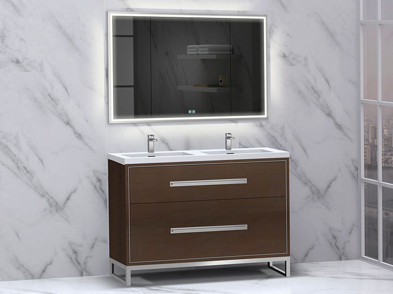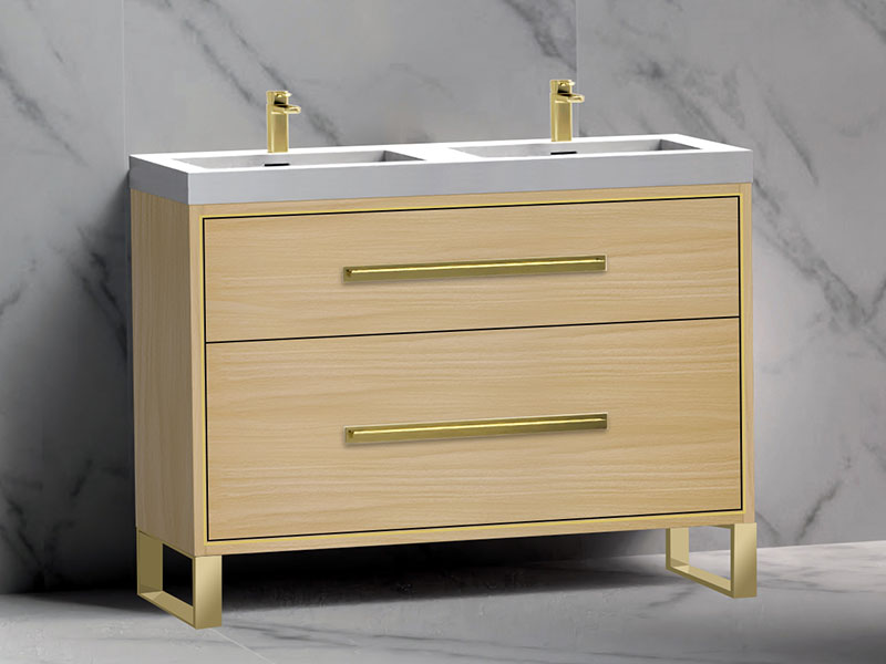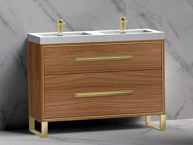 The Pinnacle Collection freestanding vanity is a blend of modern sophistication combined with more than a hint of glamour. The design features two fully adjustable drawers with finely crafted metal trim inlay and matching, long sleek handles accented with decorative backplates to imbue it with that added touch of elegance. Your choice of matching metal legs or wrap-around base adds the finishing custom touch that will make it the focal point of your bathroom. Choose from rich, polyurethane-protected color finishes including rich Natural Walnut, Natural Oak, Walnut woodgrain, White, Studio Grey and Sapphire, with metal accents available in lustrous satin brass, matte black, polished chrome, polished nickel and brushed nickel. Then complete the look with extensive countertop/basin color and material options in X-Stone™ Solid Surface, Quartzstone™, glass or ceramic. Premiere features including adjustable tempered glass dividers, full extension soft-closing glides, matching interior finishes and other signature Madeli features mean you’ll always have a perfect blend of beauty, quality and function.