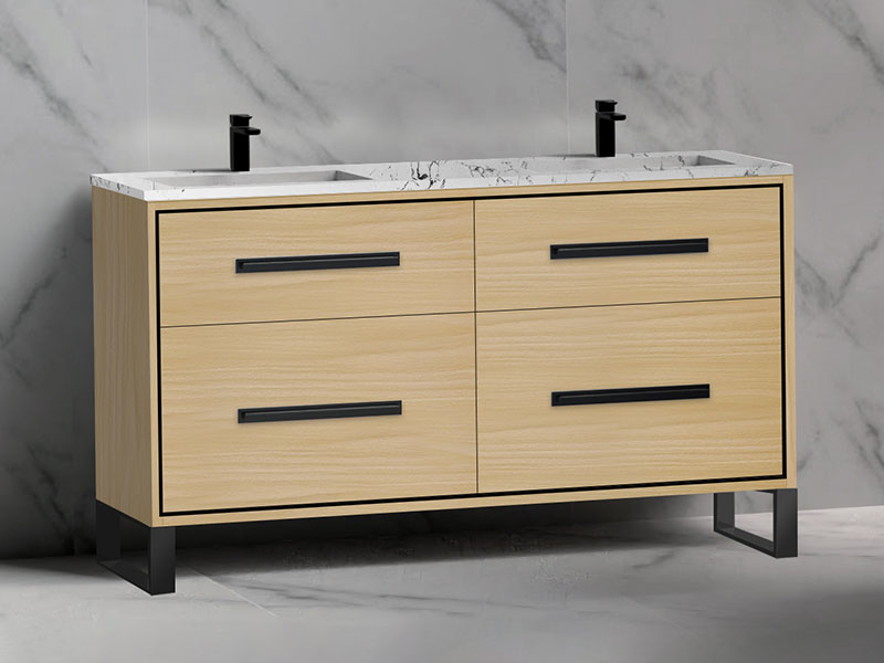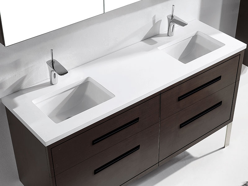 The Pinnacle Collection freestanding vanity is a blend of modern sophistication combined with more than a hint of glamour. The design features two fully adjustable drawers with finely crafted metal trim inlay and matching, long sleek handles accented with decorative backplates to imbue it with that added touch of elegance. Your choice of matching metal legs or wrap-around base adds the finishing custom touch that will make it the focal point of your bathroom. Choose from rich, polyurethane-protected color finishes including rich Natural Walnut, Natural Oak, Walnut woodgrain, White, Studio Grey and Sapphire, with metal accents available in lustrous satin brass, matte black, polished chrome, polished nickel and brushed nickel. Then complete the look with extensive countertop/basin color and material options in X-Stone™ Solid Surface, Quartzstone™, glass or ceramic. Premiere features including adjustable tempered glass dividers, full extension soft-closing glides, matching interior finishes and other signature Madeli features mean you’ll always have a perfect blend of beauty, quality and function.