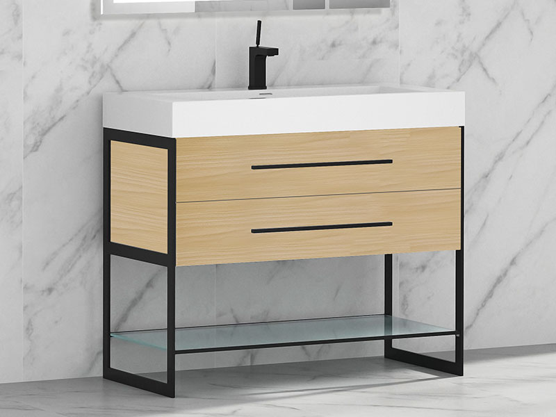 With its distinctive modern design, the Silhouette Collection freestanding vanity makes a bold statement. The geometric metal base in your choice of five lustrous finishes—satin brass, matte black, polished chrome, polished nickel and brushed nickel—lends a glamorous appeal to the streamlined silhouette, while the suspended frosted glass shelf keeps the design open and airy. Choose from rich, polyurethane-protected color finishes including Brandy and Ash Grey woodgrains, or ultra-modern White and Sapphire . Pair it with your choice of countertop/basin options in X-Stone™ Solid Surface, Quartzstone stone, glass or ceramic designs to create your custom furniture look. Premiere features including extensive storage options, soft-closing, European hardware, and other signature Madeli features make it as functional as it is beautiful.