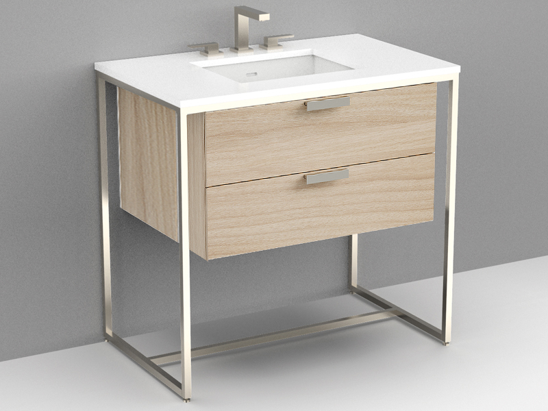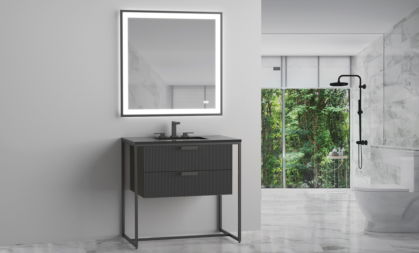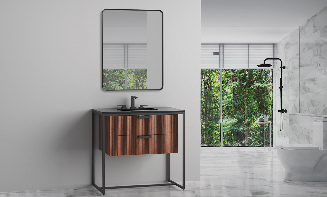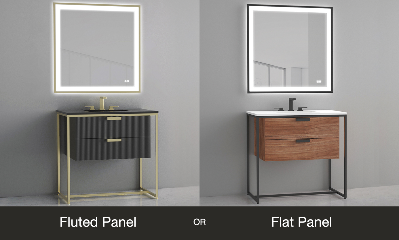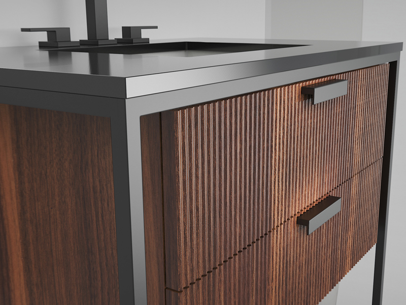 The Trapezio freestanding vanity combines architectural style with functional design, redefining traditional vanities. Its distinctive geometric shapes and bold lines enhance bathroom aesthetics, especially in compact spaces, turning them into sophisticated focal points. Available with fluted or flat front drawer panels. Available finishes include Fluted English Walnut, Fluted Matte Black, Fluted White panels, Flat Natural Oak, and Flat Natural Walnut panels. Hardware options are offered in Matte Black, Satin Brass, Polished Nickel, Brushed Nickel, and Polished Chrome. Countertop options are Black, White, White Carrara Quartzstone, or White X-Stone. This double drawer vanity measures 22" deep and comes in widths of- 30" and 36". The Trapezio model offers quality craftsmanship, premium materials, and durable construction.